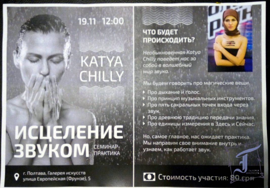 Незвичайна Katya Chilly поведе за собою до чарівного світу звуку. Буде говорити про магічні речі. Про подих і голос. Про принцип музичних інструментів. Про п’ять сакральних точок входу через звук. Про давню традицію передачі знання. Про одиниці вимірювання в Тут і Зараз.