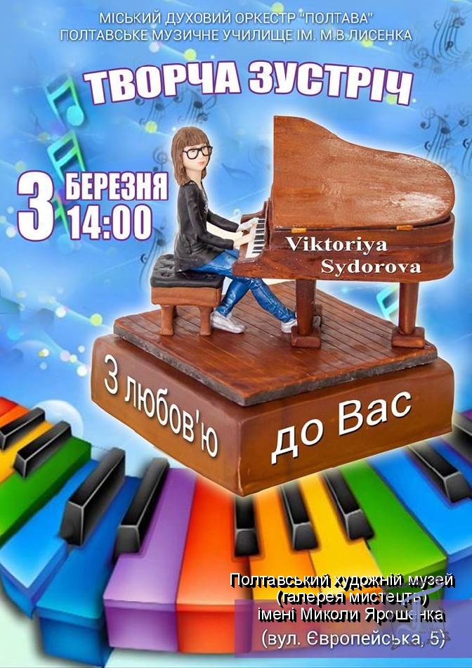 Творча зустріч з пані Вікторією – це невеличкий екскурс в її творче життя як піаністки, педагога, концертмейстера та артистки міського духового оркестру «Полтава» та біг-бенду, створеного на його базі. Велика творча сім я оточує пані Вікторію, тож буде цікаво!