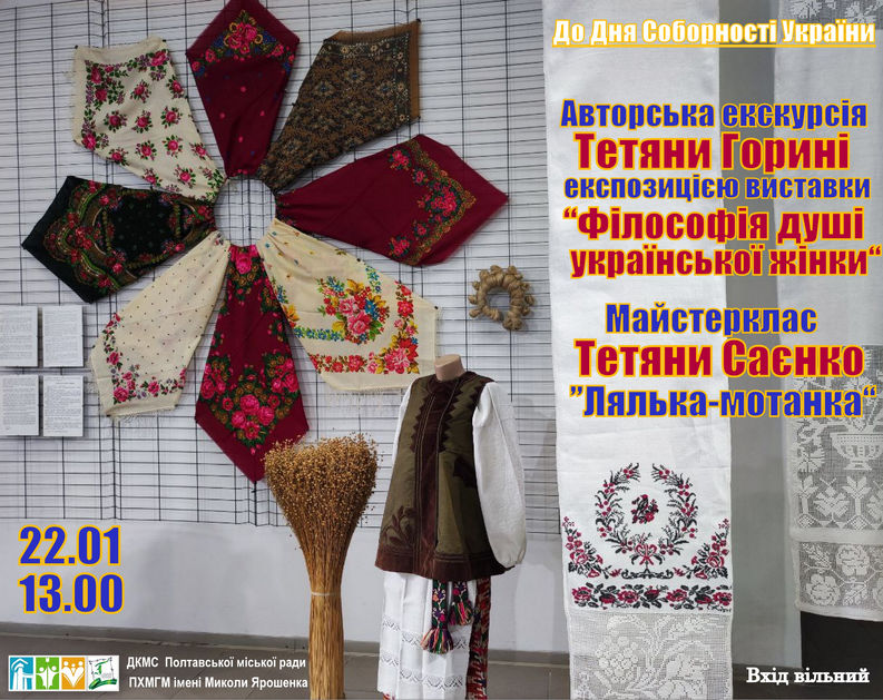 АфішаПодії Авторська екскурсія Тетяни Горині та майстерклас Тетяни Саєнко 19.01.2026 11 Ми у Facebook Ми у Twitter tweet Шановні друзі, запрошуємо вас на фінісаж мистецького проєкту “Філософія душі української жінки”, в рамках якого відбудеться авторська екскурсія Тетяни Горині виставкою та майстерклас Тетяни Саєнко “Лялька-мотанка”. Вхід – вільний