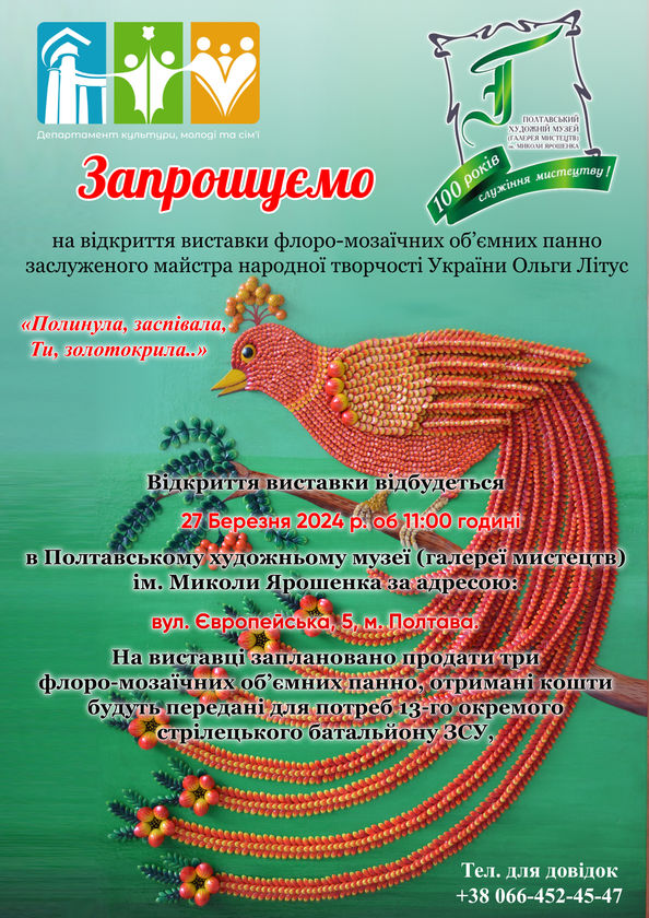 АфішаПодії Флоро-мозаїчні панно Ольги Літус 25.03.2024 114 Ми у Facebook Ми у Twitter tweet “Полинула, заспівала, Ти, золотокрила” – виставка флоро-мозаїчних об’ємних панно заслуженої майстрині народної творчості України Ольги Літуc