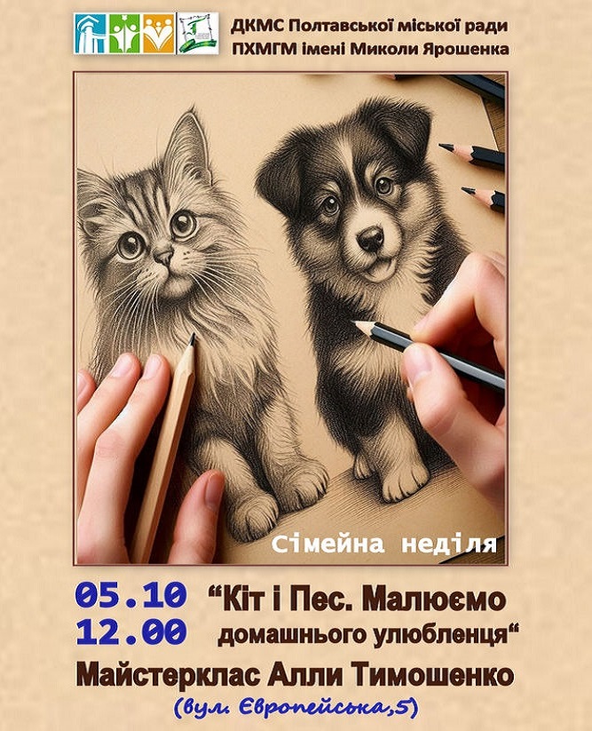 Використовуючи графічні техніки і матеріали, учасники Сімейної неділі разом із Алою Тимошенко власноруч створюватимуть образ найпоширеніших домашніх улюбленців – кота та собаки. Запрошуємо родини вимушених переселенців (безкоштовно) та усіх охочих (за музейним квитком).