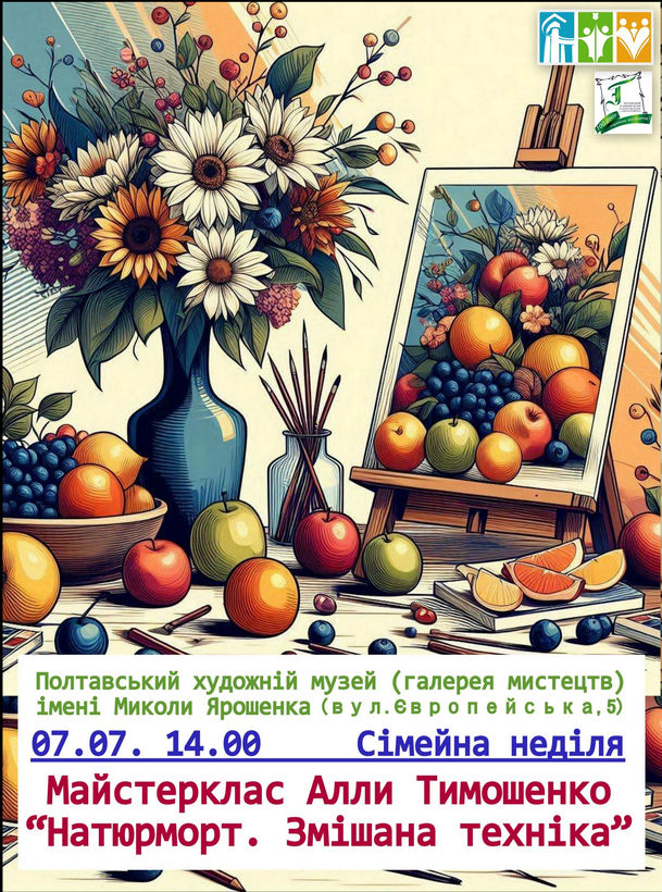 Тема першої Сімейної неділі липня – натюрморт. Натюрмортом (від французької nature morte, буквально – мертва природа) називають зображення неживих предметів, об’єднаних в єдину композиційну групу. Учасники заходу не лише дізнаються про особливості натюрморту як жанру образотворчого мистецтва, про застування різних технік, про пошуки в області композиції, кольору, форми від професійної художниці-педагога Алли Тимошенко, а й матимуть можливість випробувати свої здібносіті і створити власний шедевр.