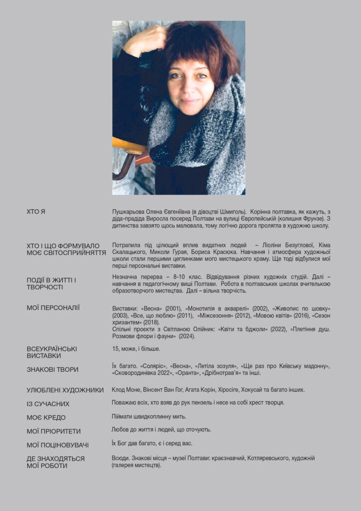 Виставка “На межі від весни до зими через літо і осінь” – персональна виставка відомої української мисткині, полтавки Олени Пушкарьової.