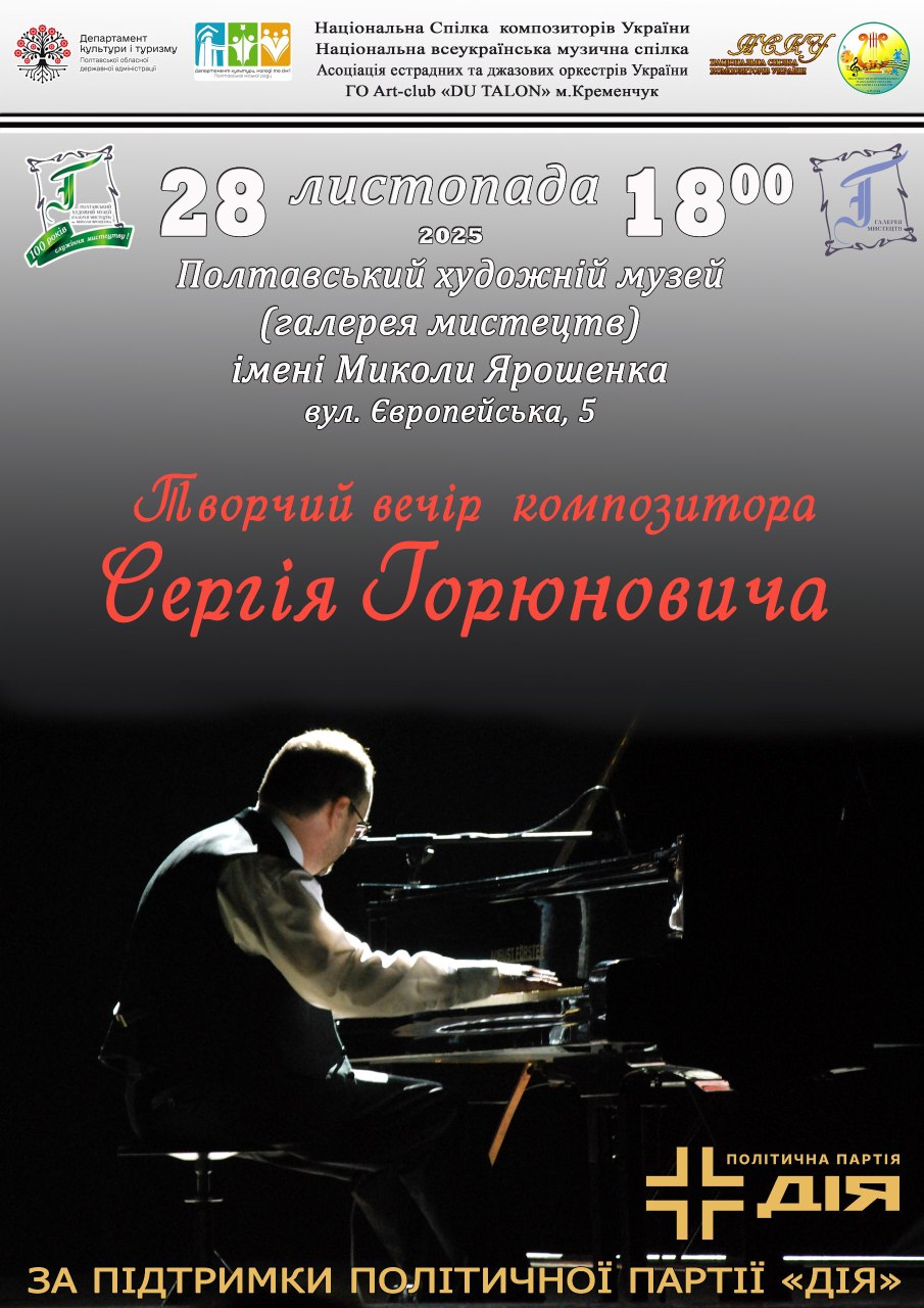 Шановні друзі, запрошуємо вас на творчий вечір знаного українського музиканта, піаніста-імпровізатора, композитора, хорового диригента, аранжувальника, голови Полтавської обласної організації Національної спілки композиторів України та керівника артклубу «Du talon» у Кременчуці, лауреата міжнародних джазових фестивалів Сергія Горюновича.