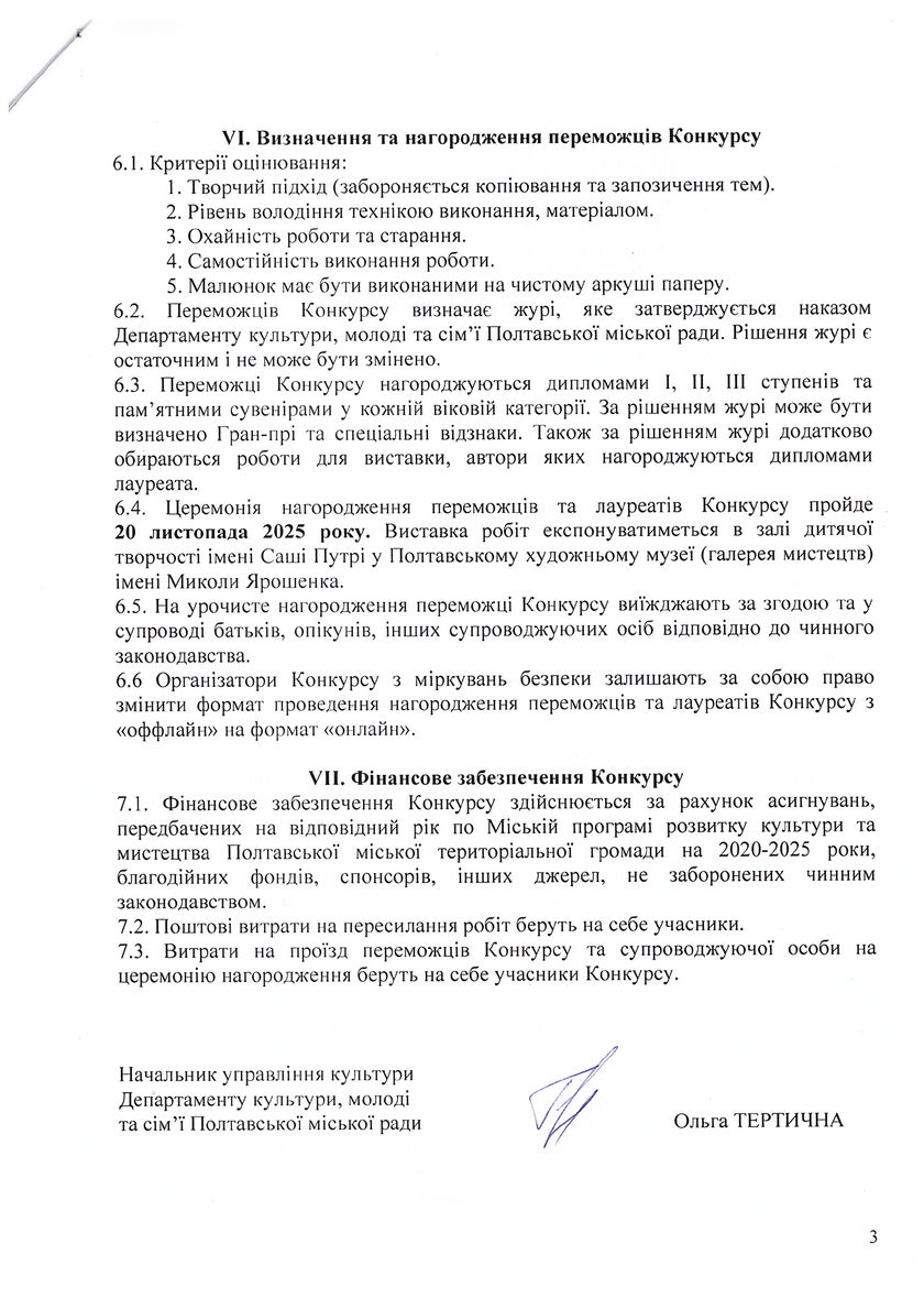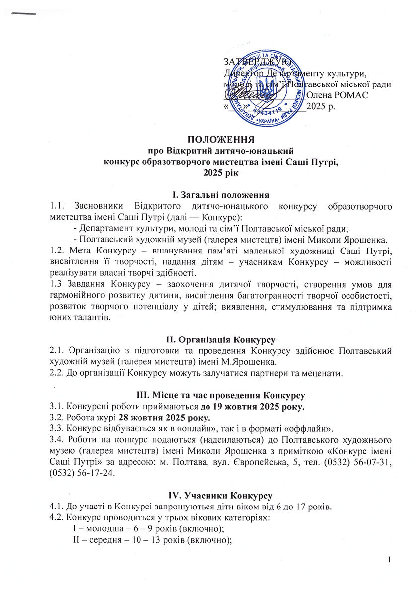 Афіша УВАГА! Конкурс імені Саші Путрі 11.07.2025 461 Ми у Facebook Ми у Twitter tweet Департамент культури, молоді та сім’ї Полтавської міської ради, Полтавський художній музей (галерея мистецтв) імені Миколи Ярошенка запрошують до участі у Відкритому дитячо-юнацькому конкурсу образотворчого мистецтва імені Саші Путрі Дізнатися про Сашу Путрю, переглянути малюнки юної художниці можна за посиланням https://www.gallery.pl.ua/11111virtualna-vistavka-malyunkiv-sashi-putri.html