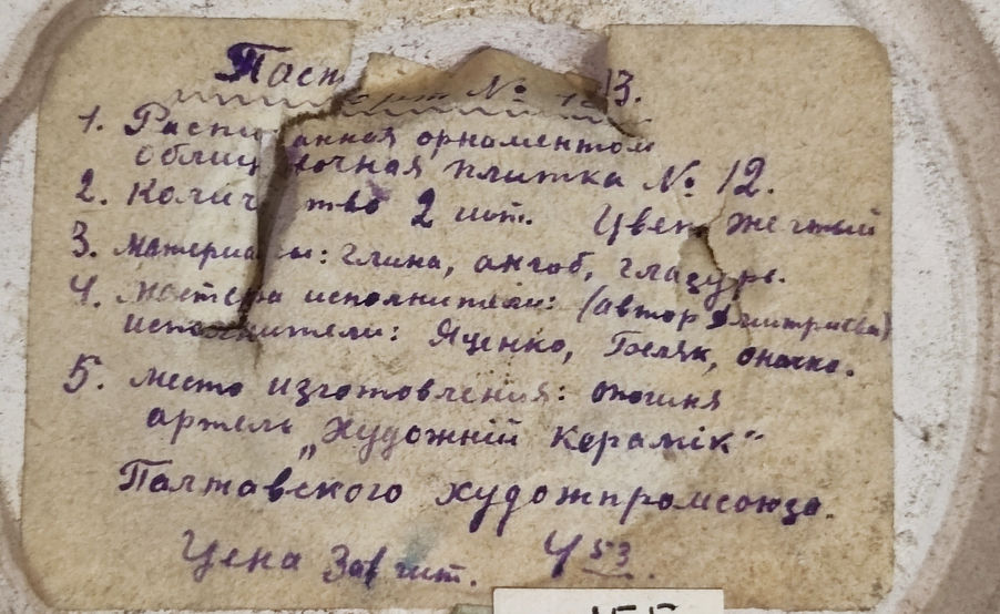 Цікаво, що музейний паспорт, розміщений на звороті облицювальної плитки також містить інформацію про її ціну – 4,53 руб. за 1 шт. Тобто ці плитки створювалися в межах артільного виробництва (для реалізації), за авторським ескізом Євгенії Дмитрієвої.