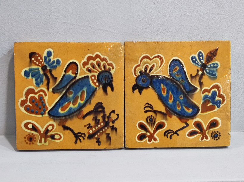 У колекції музею є облицювальні плитки авторства Євгенії Дмитрієвої, виконані майстрами артілі «Художній керамік» (Опішня). Наприклад, дві керамічні плитки з зображенням стилізованих півнів у традиційній для опішнянської кераміки техніці. Кольорова гама насичена, використані вохристі, сині, коричневі, чорні і білі кольори. Теплий охристий фон підсилює звучання контрастного синього – силуетів птахів і метеликів (комах). Зображення декоративні, узагальнені, з характерним для народного мистецтва ритмом. Образи птахів, комах, рослин поєднують простоту орнаменту з відчуттям гармонії та декоративної вишуканості. Ці плитки – приклад синтезу традиційних мотивів української народної кераміки та авторського стилю Євгенії Дмитрієвої, яка вміло поєднала узагальненість форми з декоративністю Опішні.
