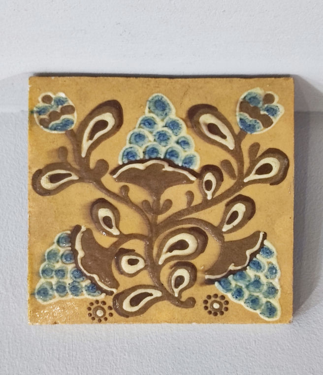 Облицювальна плитка з мотивом винограду авторства Євгенії Дмитрієвої також виготовлена в Опішні, в артілі «Художній керамік». Зображена стилізована виноградна лоза з гронами – поєднання народних орнаментів із модерністським узагальненням форми. Гнучкі лінії утворюють симетричну композицію. Коричневі контури та блакитні акценти ягід виразно контрастують на теплому вохристо-жовтому фоні. Мотив виноградної лози символізує життєву силу, плодючість і достаток, а у Дмитрієвої він набуває декоративного звучання – стає знаком гармонії природи і мистецтва.